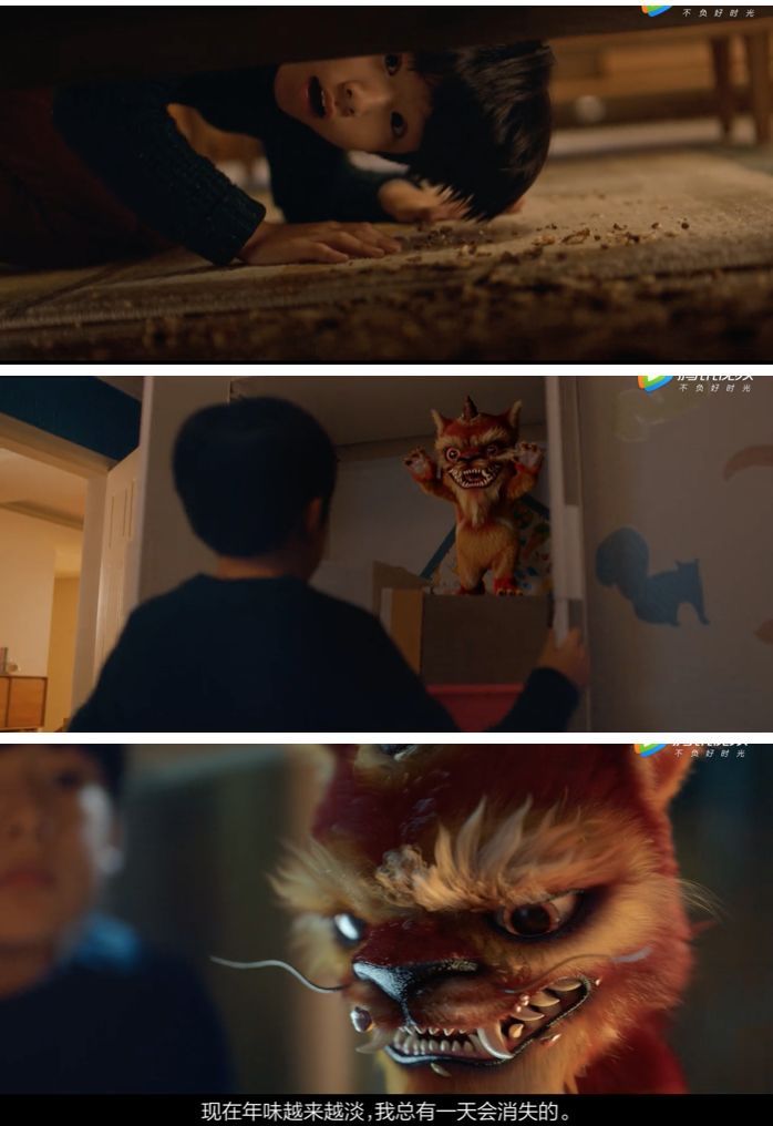影片中,小男孩偶然發(fā)現(xiàn)家中有“年獸”。可惜因?yàn)槟晡短?,年獸的身體也越變?cè)叫?。為了拯救年獸,小男孩召集全家人一起出門迎新年。在熱鬧的氣氛中,年獸終于恢復(fù)“真身”。